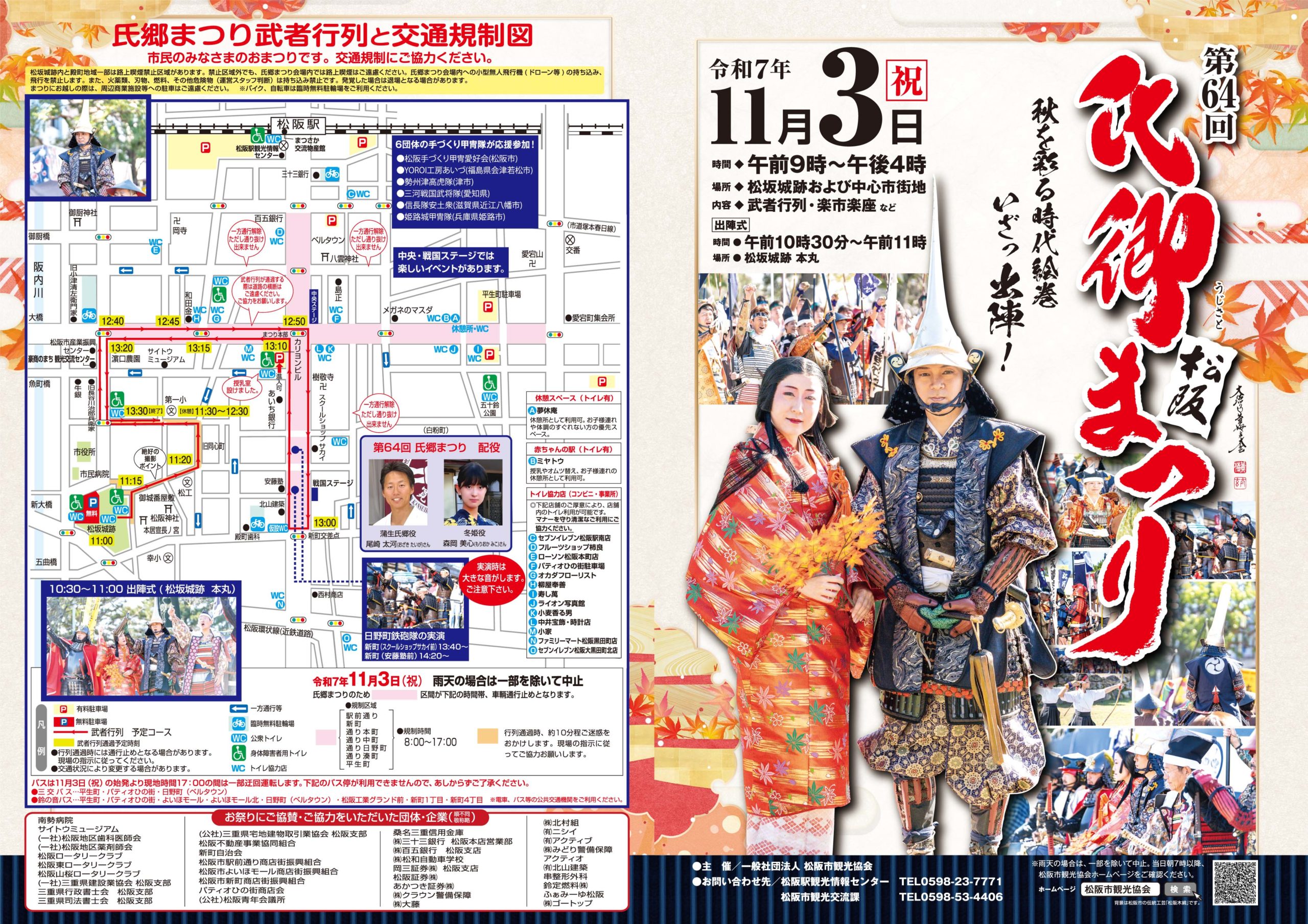 詳細はこちら、松阪市観光協会のホームページに掲載されていた「第64回氏郷まつり(武者行列)パンフレット」で。
