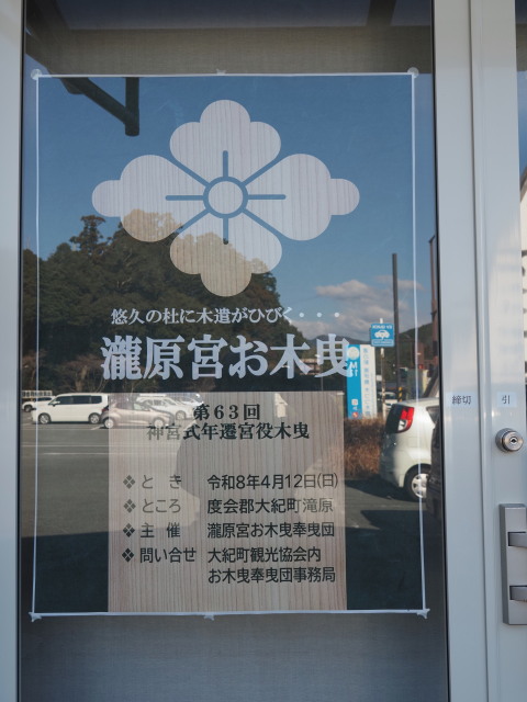 熊野古道伊勢路を歩いていても見かけたが、「瀧原宮お木曳 第63回神宮式年遷宮役木曳」のポスターが木つつ木館付近にも貼られていた。