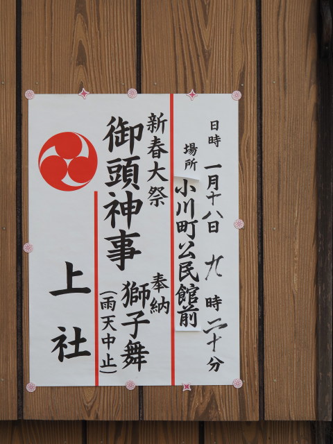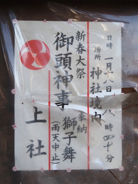 【情報】上社(伊勢市辻久留)の御頭神事は、1月18日 2025年12月31日 Posted by 【キタヰ】 2025年12月31日(水) 【情報】上社(伊勢市辻久留)の御頭神事は、1月18日 (徒歩) 御頭神事のスケジュールを確認しようと上社を訪れた。 上社(伊勢市辻久留) 掲示板を確認すると「1月18日」となっている。 御頭神事(上社 神社境内)の案内掲示 また、神社の周辺を歩くと、次の案内も見つけた。 御頭神事(辻久留公民館前)の案内掲示 御頭神事(小川町公民館前)の案内掲示 関連記事: 2025年、御頭神事はじめは上社(伊勢市辻久留) ちょこっとだけ高向大社の御頭神事 2025 御頭神事(高向大社)祭典・日和見・七起の舞・コドノ社拝礼・布久目物へ(2024) 高向御頭神事 打祭り(伊勢市御薗町高向) Updated: 2025年12月31日 at 4:13 PM タグ: 御頭神事, 獅子舞 ◀ マンロックもマテリアルロックも立ち上がっていたP6、P7橋脚の工事現場(宮川橋架替工事) お伊勢さん125社のまいり納めは清野井庭神社(豊受大神宮 摂社) ▶ コメントを残す コメントをキャンセルメールアドレスが公開されることはありません。 ※ が付いている欄は必須項目ですコメント ※ 名前 ※ メール ※ サイト